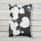 A bold black and white leaf design outdoor pillow is an original design for home accent decor. Original photograph copyright Ann Powell.