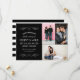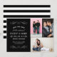 Dramatic and modern, this save the date pairs a bold black art deco panel featuring white flourish scroll accents and elegant typography with three couple photos in a striking grid layout, and a black and white stripe card reverse. A high-impact design that makes an unforgettable first impression. All text is fully customizable.