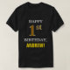 This simple birthday-themed, black-colored shirt design features a warm birthday wish like "HAPPY 1st BIRTHDAY, ANDREW!" on the front, in bold text. The birthday number has a faux/imitation gold-like coloring appearance. The name on the front can be personalized. A shirt like this could be worn to a birthday party for somebody who is celebrating their first birthday. [~Z0000318]