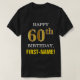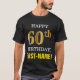 This simple birthday-themed, black-colored shirt design features a warm birthday wish like "HAPPY 60th BIRTHDAY, FIRST-NAME!" on the front, in bold text. The birthday number has a faux/imitation gold-like coloring appearance. The name on the front can be personalized. A birthday-themed shirt like this could be fun to wear at a birthday party being held for somebody who is celebrating their sixtieth birthday. [~Z0000318]