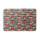 This beautiful black and white striped bath mat has large red poinsettia flowers with green leaves, brown pine cones, and red berries on it.