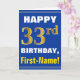 This simple birthday-themed greeting card design features a warm birthday wish like "HAPPY 33rd BIRTHDAY, First-Name!" on the front, in bold text on a blue colored background. The birthday number has a faux/imitation gold-like coloring look. The name on the front can be personalized. The inside features a customizable birthday message. A greeting card like this could be a fun way to deliver birthday wishes to somebody who is celebrating their thirty third birthday. [~Z0000278]