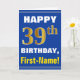 This simple birthday-themed greeting card design features a warm birthday wish like "HAPPY 39th BIRTHDAY, First-Name!" on the front, in bold text on a blue colored background. The birthday number has a faux/imitation gold-like coloring appearance. The name on the front can be personalized. The inside features a customizable birthday message. A greeting card like this could be a fun way to deliver birthday wishes to somebody who is celebrating their thirty ninth birthday. [~Z0000278]