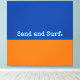 Sharing a favorite place to go in summer - to the shore. This bright, modern, abstract minimalist design features color and words to evoke a sense of place. The bottom third of the canvas is drenched in bright warm orange, the top in rich, deep blue. The optional text "Sand and Surf" is written in playful typography at the bottom of the blue sea color block and can be personalized. A little open clam drawing rests at the intersection of sea and beach.