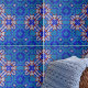 This ceramic tile's design is characterized by symmetrical patterns that create a harmonious visual effect. The tile is adorned with an array of geometric shapes, including diamonds and stars, that interlock in a complex, yet aesthetically pleasing manner. The color palette is dominated by various shades of blue, from the cool tranquility of turquoise to the depth of navy. These blues are beautifully contrasted by touches of white and red, adding a sense of dimension and vibrancy to the design. The pattern is repetitive, mirroring itself both horizontally and vertically across the tile. This repetition, combined with the distinct outlines of each shape, makes the pattern pop against the colorful backdrop.