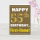 This simple birthday-themed greeting card design features a warm birthday wish like "HAPPY 55th BIRTHDAY, First-Name!" on the front, in bold text on a brown colored background. The birthday number has a faux/imitation gold-like coloring appearance. The name on the front can be personalized. The inside features a birthday message that can be personalized. A greeting card like this could be a fun way to deliver birthday wishes to somebody who is celebrating their fifty fifth birthday. [~Z0000281]
