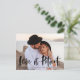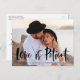 Stylish, trendy wedding postponement postcards displaying your favorite horizontal engagement photo with "Love is Patient" in a black, modern brush script overlay. Personalize the front of the photo change of plans card by adding your names and wedding postponement wording. The back of the postcard features your return address, names, wedding website, etc.