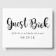 A striking wedding guest book featuring oversized "Guest Book" in bold black brush script lettering on a clean white cover. The couple's names and wedding date in modern typography create a chic, minimalist design. The spine is personalized with the couple's names and date. Customize the couple's names and wedding date.