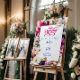 This wedding welcome sign features a vibrant, artistic design with a modern watercolor aesthetic. The background showcases bold, expressive brushstrokes in shades of pink, blue, and purple, blended with delicate splatters to create an abstract and lively composition. Surrounding the central text are elegant floral elements, including roses, peonies, and buds in soft pinks, whites, and blues, adding a touch of romance and natural beauty. The typography balances classic and contemporary styles, with "Welcome” prominently displayed in a playful calligraphy script as well as the names. The details of the event use a more traditional serif font. Overall, the design conveys a fresh, whimsical feel, perfect for a couple looking to make a statement with their wedding. Personalize the text regarding the names and details of the wedding