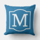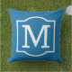 A bold outdoor pillow featuring a white monogram initial inside a decorative bracket frame on a vibrant cobalt blue background. The oversized serif letter and elegant notched border create a striking, preppy accent for poolside seating, patio furniture, or deck chairs. The initial is fully customizable.