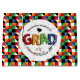 It's all about the bold colors here as your graduate steps out into the world. The word GRAD in four colors chopped into segments with a confetti background. Pattern of red, green, blue, yellow, black, and white in half-square triangles forms the border. Overall a great festive look for invitations or party supplies. Personalize with the graduate's name, school and class year. Matching products available.