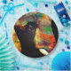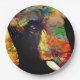 Paper plates with an elephant head in bold vibrant colors of yellow, green, orange and more giving it a random abstract look to it. Set on a black background.