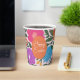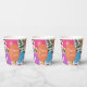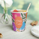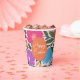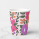 These beautiful Easter paper cups feature a hand drawn floral design in magenta pink, purple, orange, golden yellow, blue, and green over a custom color background (shown in light pink). Stylish text reading, "Happy Easter" stands out against an orange Easter egg.