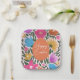 These beautiful Easter paper plates feature a hand drawn floral design in magenta pink, purple, orange, golden yellow, blue, and green over a custom color background (shown in light pink). Stylish text reading, "Happy Easter" stands out against an orange Easter egg.