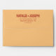A retro modern hand written bright colorful wedding envelope. Which features bold bride and groom's names in rust color. And personalized return address . On simple vintage color background. Which suits the whole wedding suite.