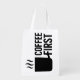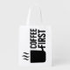 A minimalist and modern design featuring a steaming cup of coffee accompanied by the phrase "Coffee First" in bold typography. This backgroundless vector image is perfect for crisp printing on tote bags. Ideal for coffee lovers, early risers, students, and fans of clean design.