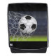 This bold face backpack is shown in the solid color black with a photo print of a sports soccer ball..