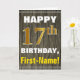 This simple birthday-themed greeting card design features a warm birthday wish like "HAPPY 17th BIRTHDAY, First-Name!" on the front, in bold text on a faux wood appearance pattern background. The birthday number has a faux/imitation gold-like coloring appearance. The name on the front can be personalized. The inside features a customizable birthday message. A greeting card like this could be a fun way to deliver birthday wishes to somebody who is celebrating their seventeenth birthday. [~Z0000280]