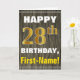 This simple birthday-themed greeting card design features a warm birthday wish like "HAPPY 28th BIRTHDAY, First-Name!" on the front, in bold text on a faux wood appearance pattern background. The birthday number has a faux/imitation gold-like coloring appearance. The name on the front can be customized. The inside features a customizable birthday message. A greeting card like this could be a fun way to deliver birthday wishes to somebody who is celebrating their twenty eighth birthday. [~Z0000280]
