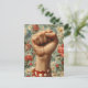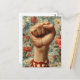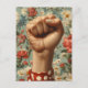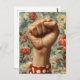 A realistic painting of a clenched fist raised in front of a vibrant floral background. The contrast between strength and beauty creates a striking visual impact.