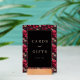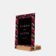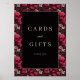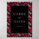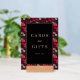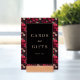 This wedding tabletop sign features a striking black square at the center, surrounded by intricate floral and skull motifs in vibrant reds and muted pinks. The design combines gothic and baroque influences with clean lines and solid fills, creating a modern yet vintage aesthetic. Elegant serif typography in gold reads "Cards and Gifts" with a smaller "Thank You" below, adding a formal touch to the bold composition. Perfect for expressing gratitude with a daring flair, this sign is ideal for memorable celebrations.