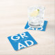 Custom graduation paper coasters featuring "Grad" in bold white lettering with a blue background. Personalize the graduation coasters by adding the graduate's name and graduation year. The personalized graduation coasters are perfect for both high school and college graduation parties.