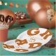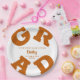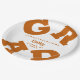 GRAD in bold burnt orange lettering curves around the edges of these white graduation party paper plates - available in 2 sizes. Congratulations above the name of your graduate and the Class of below. The perfect addition to your table decor for upcoming grad parties. CHANGE THE COLORS to anything! **TIP: Click on CUSTOMIZE further link; click on COLOR box on top right; enter your color hex code in the #xxxxxx box to match your school colors. SEE ENTIRE COLLECTION of pre-done color combinations, napkins and more ---> http://bit.ly/2EmBPHc <---