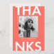 Trendy, modern graduation thank you card featuring the graduate's photo with "Thanks" in bold white lettering and coral background. Personalize the front of the photo graduation thank you card by adding the graduate's name, school name, and graduation year. The back of the graduation photo thank you card features space for your typed or handwritten message with a coral and white geometric pattern.