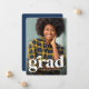 With a bold retro grad in white, this vertical one-photo card is the perfect way to announce your graduate to family and friends. The vintage styling is subtle and simple for this graduation announcement and perfectly on trend for this graduating class. The back of this card is navy blue with a speckled texture. The blue color can be changed by clicking "customize further."