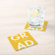 Custom graduation paper coasters featuring "Grad" in bold white lettering with a yellow background. Personalize the graduation coasters by adding the graduate's name and graduation year. The personalized graduation coasters are perfect for both high school and college graduation parties.