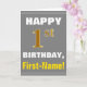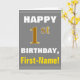 This simple birthday-themed greeting card design features a warm birthday wish like "HAPPY 1st BIRTHDAY, First-Name!" on the front, in bold text on a gray (grey) colored background. The birthday number has a faux/imitation gold-like coloring appearance. The name on the front can be customized. The inside features a birthday message that can be customized. A greeting card like this could be a fun way to deliver birthday wishes to somebody who is celebrating their first birthday. [~Z0000283]