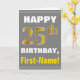 This simple birthday-themed greeting card design features a warm birthday wish like "HAPPY 25th BIRTHDAY, First-Name!" on the front, in bold text on a gray (grey) colored background. The birthday number has a faux/imitation gold-like coloring appearance. The name on the front can be personalized. The inside features a birthday message that can be personalized. A greeting card like this could be a fun way to deliver birthday wishes to somebody who is celebrating their twenty fifth birthday. [~Z0000283]