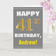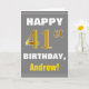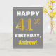 This simple birthday-themed greeting card design features a warm birthday wish like "HAPPY 41st BIRTHDAY, Andrew!" on the front, in bold text on a gray (grey) colored background. The birthday number has a faux/imitation gold-like coloring look. The name on the front can be customized. The inside features a customizable birthday message. A greeting card like this could be a fun way to deliver birthday wishes to somebody who is celebrating their forty first birthday. [~Z0000283]