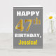 This simple birthday-themed greeting card design features a warm birthday wish like "HAPPY 47th BIRTHDAY, Jessica!" on the front, in bold text on a gray (grey) colored background. The birthday number has a faux/imitation gold-like coloring look. The name on the front can be personalized. The inside features a birthday message that can be customized. A greeting card like this could be a fun way to deliver birthday wishes to somebody who is celebrating their forty seventh birthday. [~Z0000283]