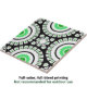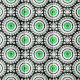 This ceramic tile features intricate patterns that radiate outward from the center, creating a captivating kaleidoscope effect. The dominant colors are black, white, and a striking shade of green. The black and white form the base of the design, with symmetrical shapes including triangles and rectangles. These monochromatic elements provide a stark contrast to the vibrant green shapes, which appear to be stylized floral or sun designs, interspersed within the geometric patterns. The design is symmetrical, with repeating elements that create a sense of harmony and balance. This symmetry, combined with the bold color palette and intricate detailing, gives the tile a modern and stylish appeal. It’s a versatile piece that could complement various interior styles, from contemporary to eclectic.