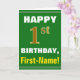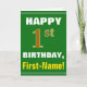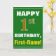 This simple birthday-themed greeting card design features a warm birthday wish like "HAPPY 1st BIRTHDAY, First-Name!" on the front, in bold text on a green colored background. The birthday number has a faux/imitation gold-like coloring appearance. The name on the front can be personalized. The inside features a customizable birthday message. A greeting card like this could be a fun way to deliver birthday wishes to somebody who is celebrating their first birthday. [~Z0000279]