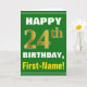 This simple birthday-themed greeting card design features a warm birthday wish like "HAPPY 24th BIRTHDAY, First-Name!" on the front, in bold text on a green colored background. The birthday number has a faux/imitation gold-like coloring appearance. The name on the front can be personalized. The inside features a birthday message that can be customized. A greeting card like this could be a fun way to send birthday wishes to somebody who is celebrating their twenty fourth birthday. [~Z0000279]