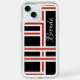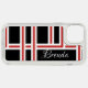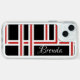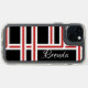 Eye-catching red and white vertical lines on your choice of background color with a template for your name or other phrase makes your phone stand out and easy to find in a sea of phones on a charging table or other phone-crowded area. Design description: Tiled red and white rectangles create horizontal and vertical lines. On the right hand side is a template for your name or other text. One or two short words works best in the space. As shown, on a standard black background that you can change to whatever you want.