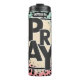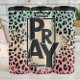 This modern graphic features the word "PRAY" in large, dark, block letters, vertically arranged within a white rectangular frame. The background showcases a vibrant leopard print with a soft gradient transition from light teal to pink. A dashed green border outlines the entire design, offering a stylish and encouraging call to spiritual devotion.
