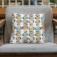 Add a pop of color to your bed or sofa with this adorable retro throw pillow. It features the bright and bold colors of turquoise, two shades of orange, gold, and tan, and black.
