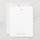 Minimalist personalized stationery with a modern monogram design, perfect for professional correspondence or sophisticated personal notes. The front features a clean white background with a monogram initial at the top and a name displayed in sleek red serif lettering at the bottom, creating a refined and contemporary layout. The reverse side showcases a striking abstract swirl pattern in bold red and pink, adding a modern artistic contrast that elevates the design’s uniqueness. Ideal for business professionals, writers, or anyone who values stylish custom stationery with a clean yet artistic flair.