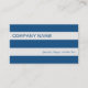 Modern business cards feature bold blue and gray stripes on the front with your company name and slogan in blue text on the gray stripes. The back features your name, job title/specialty, and contact information in blue text on a gray background. Replace the text with your own in the sidebar. You don't have to include all of the sample contact info types (like an address if you are web-based) and you can add things which aren't displayed like a social media handle if you want.