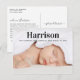 This modern birth announcement postcard features bold typography and a large photo. On the front of the postcard, your newborn's name is written in modern type across the top, with her or his full name and birth date added below. The text overlays your favorite photo. On the back, you can add a longer custom message to recipients, and include your baby's birth stats.