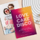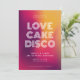 Bold Unique Retro Pink Yellow Gradient Wedding Save the Date invitation template with unique typography for "Love, Cake, Disco" and custom photo on the back.