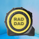 This fun tape measure features a yellow background that matches the yellow ring and yellow on the back. Funky, modern retro typography reads, "RAD DAD." Makes a great stocking stuffer, Father's Day gift, or gift for any other occasion! Text and background color can both be customized, if desired.
