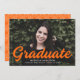 Simple and stylish graduation announcement featuring the graduate's horizontal photo with "Graduate" in a bold orange script. Personalize the photo graduation announcement by adding the graduate's name, school name, and graduation year. The announcement reverses to display an orange and white geometric arch pattern.