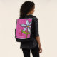 This Bold Face adult backpack with a interchangable front face has a bold bright white pop art type daisy flower on a green stem with leaves accented by white circles on a vibrant painted look pink background. Customize your name with the template.