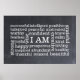 I AM is written in the center, surrounded by positive words and qualities in horizontal and vertical orientation. Easy to read modern font lettering, shown in white to resemble white chalk with a faux blackboard style background. Success, peace, confidence, love, health, gratitude and strength, among other good attributes are included. Read each word aloud in the morning and start your day off feeling empowered and full of good vibes. I am grateful! I am abundant!