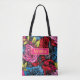 A bold maximalist pattern with bright red, pink, and blue flowers, electric green leaves, and grey goth accents.