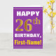 This simple birthday-themed greeting card design features a warm birthday wish like "HAPPY 26th BIRTHDAY, First-Name!" on the front, in bold text on a purple colored background. The birthday number has a faux/imitation gold-like coloring look. The name on the front can be personalized. The inside features a birthday message that can be customized. A greeting card like this could be a fun way to deliver birthday wishes to somebody who is celebrating their twenty sixth birthday. [~Z0000277]
